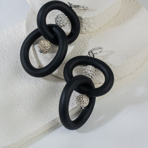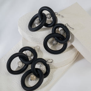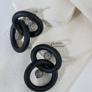 Sleek black rubber tubing with sparkling rhinestone beads forms modern, eye-catching drop earrings: bold, light, and unmistakably NYET.