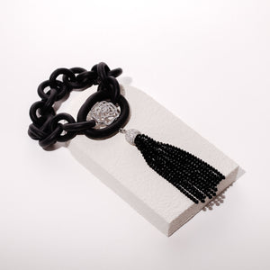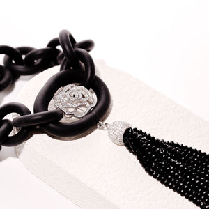 Unapologetically glamorous, this bracelet blends urban edge with delicate sparkle. Feather-light and flexible, it slips on effortlessly, yet, delivers maximum presence: the perfect accessory for making every gesture a statement. Crafted from lightweight black rubber tubing rings, the bracelet features a long black Austrian crystal tassel that adds movement and drama, paired with a sparkling camellia CZ charm for sculptural elegance. Its naturally elastic design fits most wrists comfortably, and with no clasps or fuss, it wears silently and effortlessly.