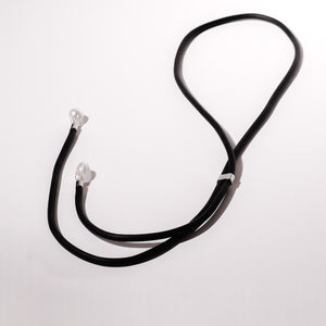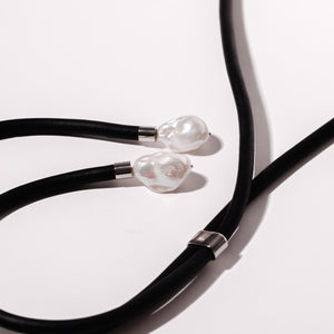 This piece is an elegant version of the traditional lariat. A sleek XL strand of rich black rubber tubing terminates in two striking baroque pearls, letting the design drape, wrap and accentuate your form.