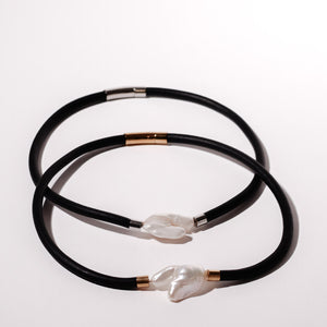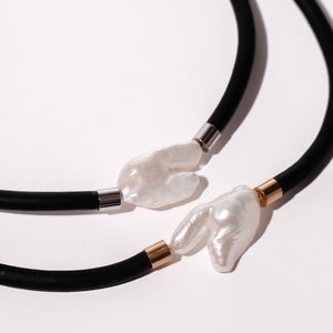 In this piece, simplicity becomes strength. A strand of matte black rubber tubing frames a large, luminous keshi pearl, letting the pearl’s unique form and natural luster take center stage. The contrast between the bold, industrial material and the soft organic pearl creates a striking tension that feels modern yet timeless. Available in two sizes, and in silver or gold tones.