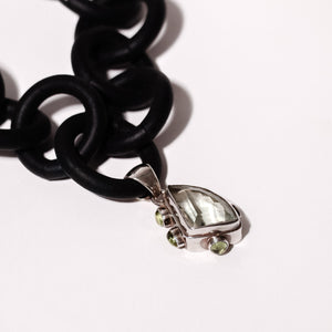 Black rubber chain necklace with a free‑form green amethyst flanked by five vivid peridots, silver bezel setting: a pendent like you have never seen before.