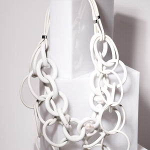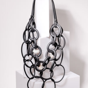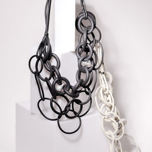 The design features three rows of black rubber tubing rings, each of different thickness and size, for a graphic, yet, fluid silhouette.