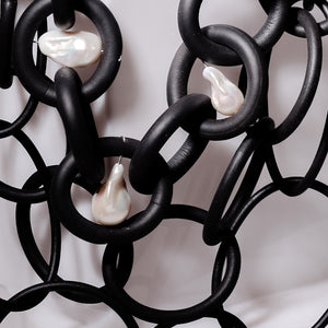 Three bold rubber strands of different shapes and diameter meet three luminous baroque pearls: architecture meets organic luxury.