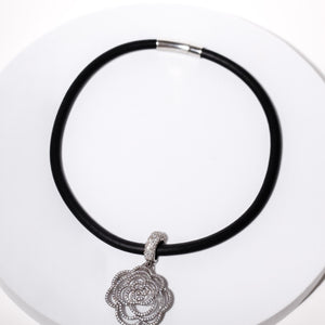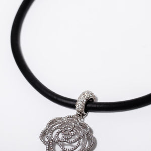 Urban elegance blooms: matte black rubber necklace anchored by a sparkling camellia fllower pendant paved with CZ crystals.