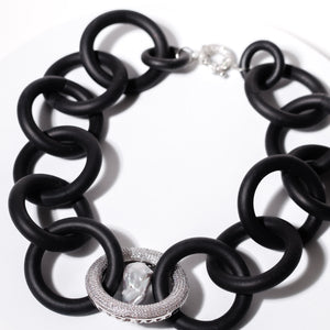 Black Rubber Tubing; Cubic Zirconia; freshwater Baroque Pearl.