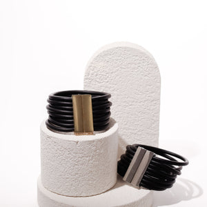 Where modern minimalism meets everyday ease, the Raya Bracelet pairs sleek stainless steel with supple rubber for a statement that’s effortlessly wearable. Key features: Eight strands of soft, durable matte black rubber. Secure magnetic closure: easy to put on, stays in place. Available in stainless steel or gold over stainless steel finish. Custom sizing available upon request. Lightweight & travel-friendly: perfect for daily wear