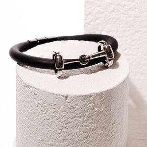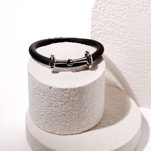 Equestrian edge meets urban cool. Sleek black rubber, magnetic clasp, and a stainless steel horse bit centerpiece.