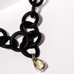 This necklace captures the essence of modern elegance through contrast. The supple matte rubber chain offers a sculptural frame for a vivid tear drop-cut lemon topaz, its golden hue glowing with quiet brilliance. The result is a piece that feels architectural, ye,t fluid. Refined enough for evening wear, yet effortlessly contemporary for day. A timeless statement of confidence and clarity.