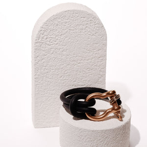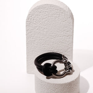 This one is a shoutout to the leather bracelet that started it all, the Signature bracelet! This new edition is crafted from supple black rubber, with the signature stainless steel anchor shackle that put NYET jewelry on the map. This bracelet features a knotted design for texture and visual interest, accented by a anchor shackle clasp that adds both function and sophistication. Lightweight and flexible, minimalist, yet, impactful, this bracelet transforms simple materials into a statement of refined strength.