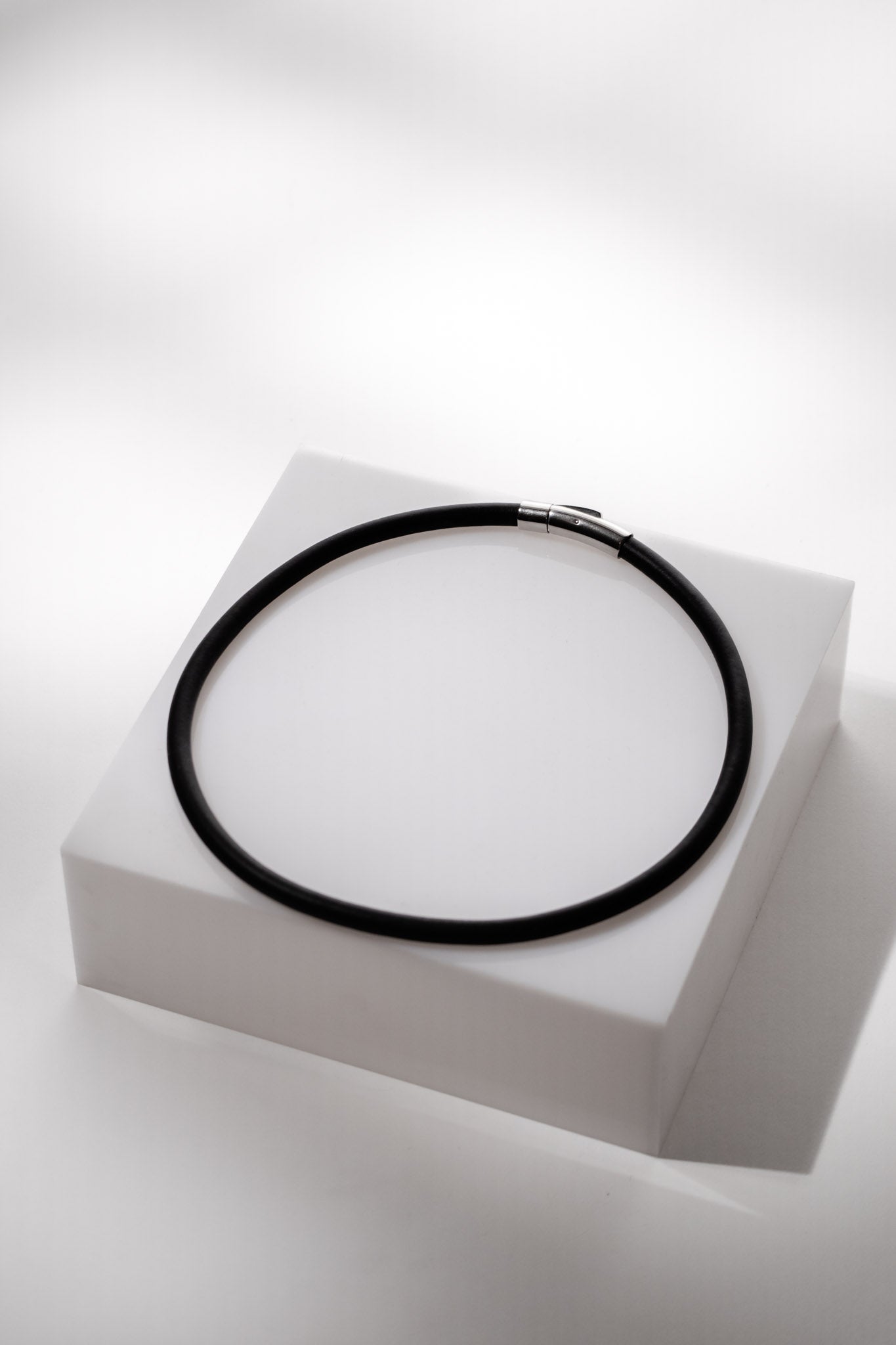 Black rubber cord necklace with a sleek bayonet clasp—minimalist, refined, and effortlessly showcasing your pendant with a subtle touch of silver.