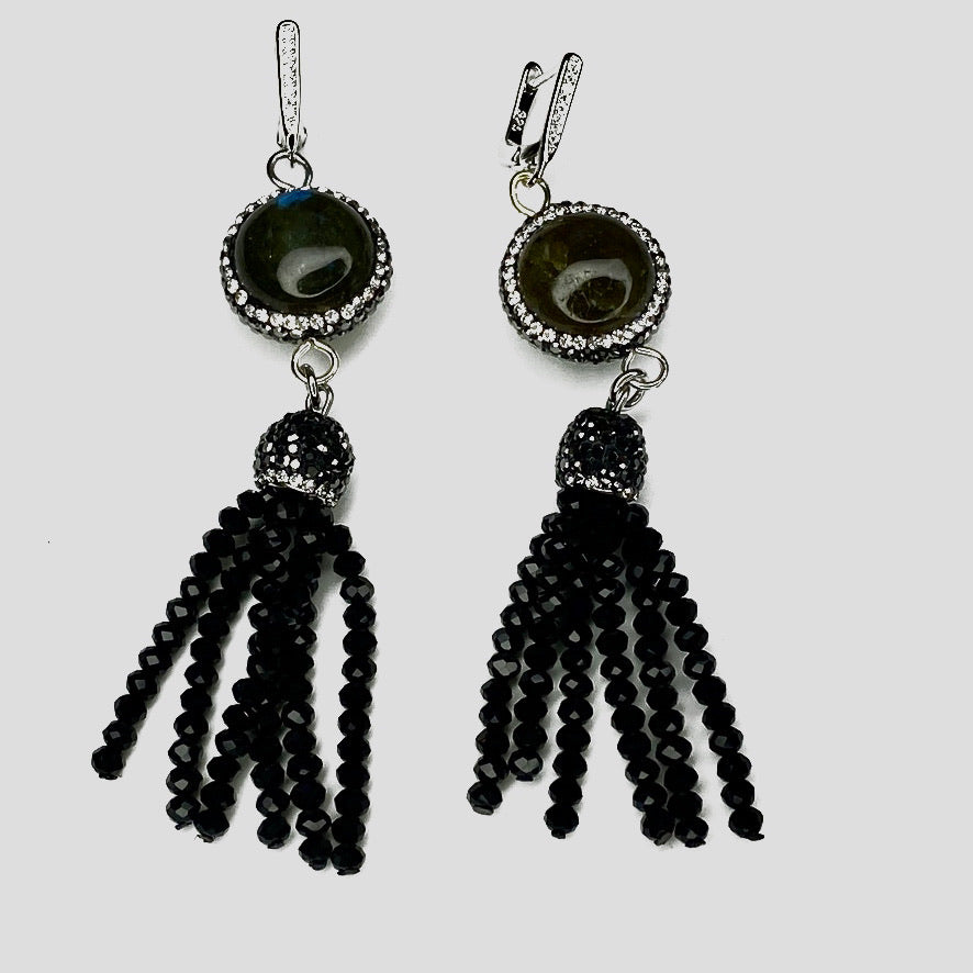 Labradorite, pave rhinestones and black crystal tassel earrings