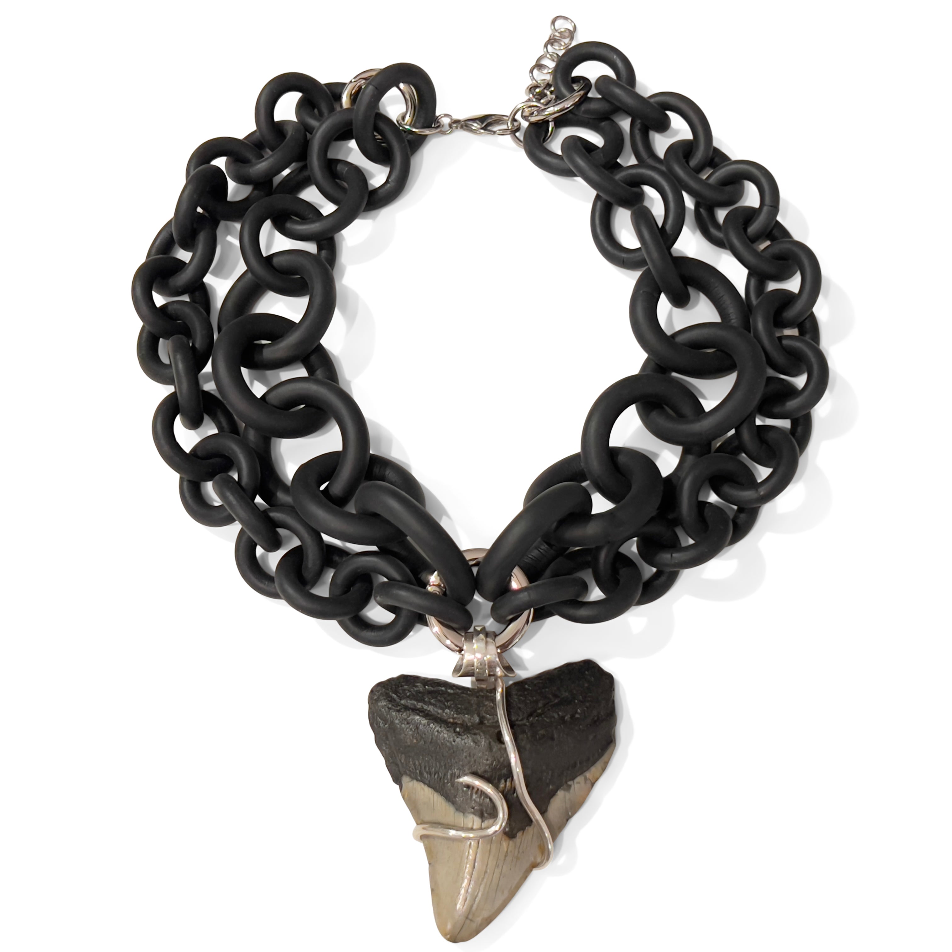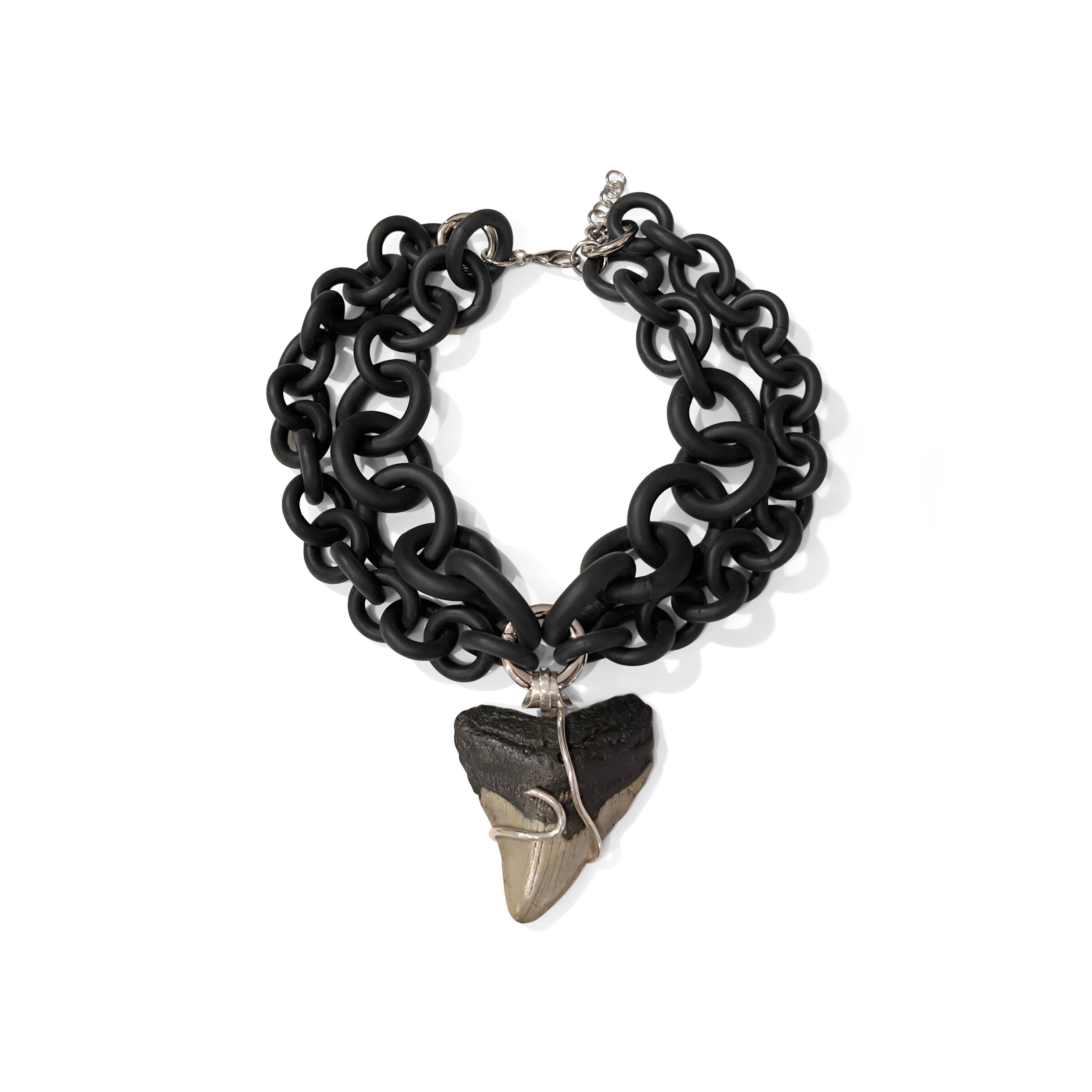 2-STRAND BLACK RUBBER NECKLACE WITH OVERSIZED MEGALODON TOOTH WRAPPED IN SILVER.
