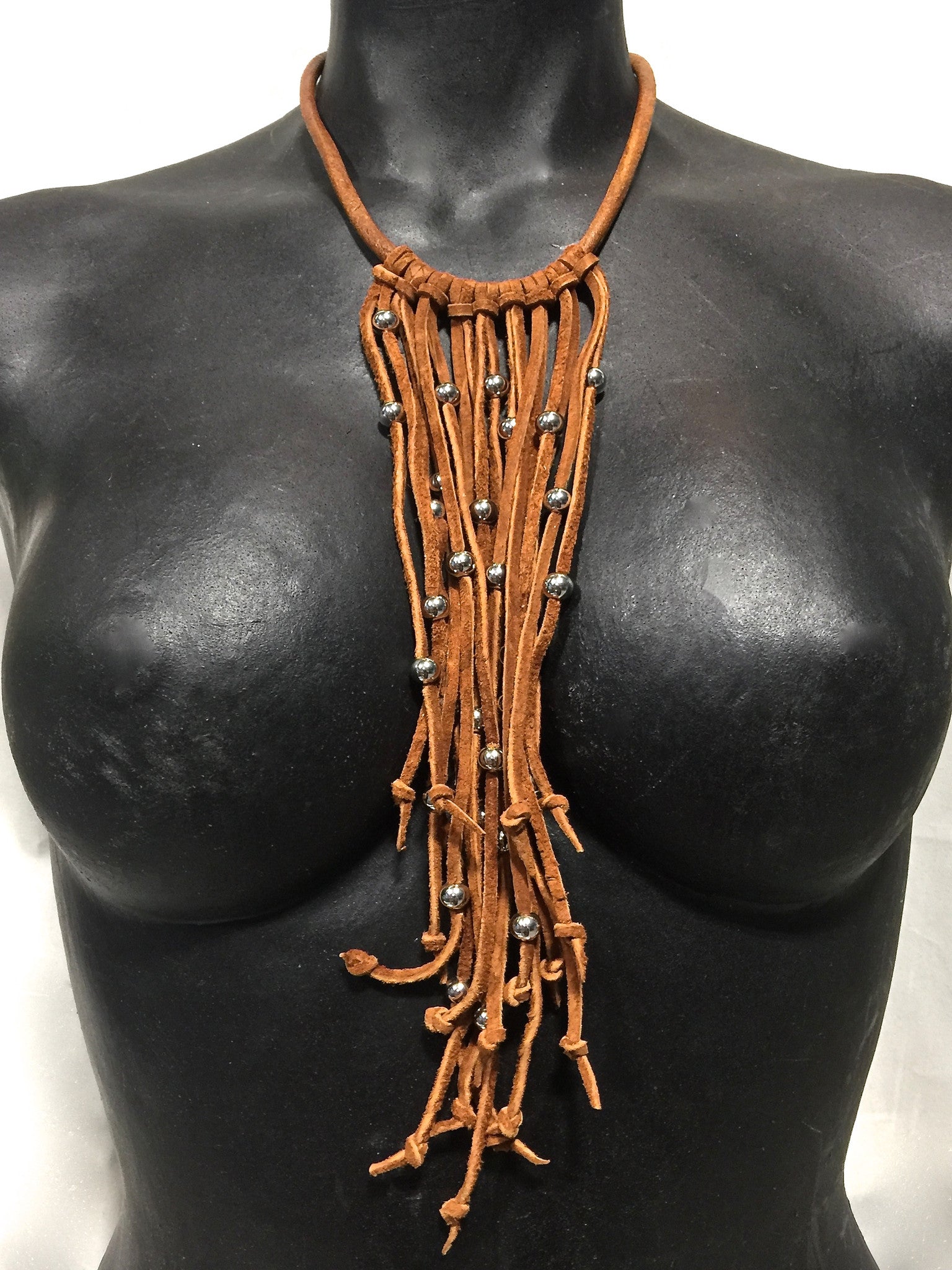 • Numerous strands of soft suede with stainless steel beads strung onto them.