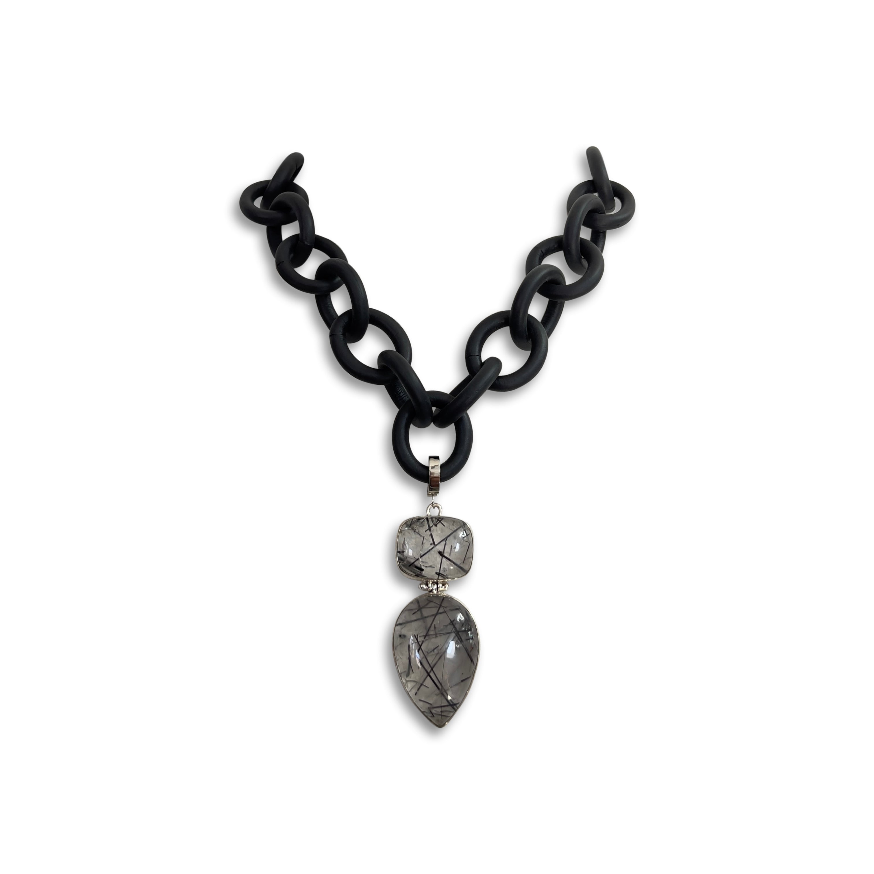 BLACK RUBBER NECKLACE WITH PENDENT BEZEL SET IN SILVER WITH TWO RUTILATED QUARTZ STONES.